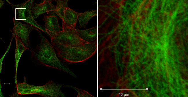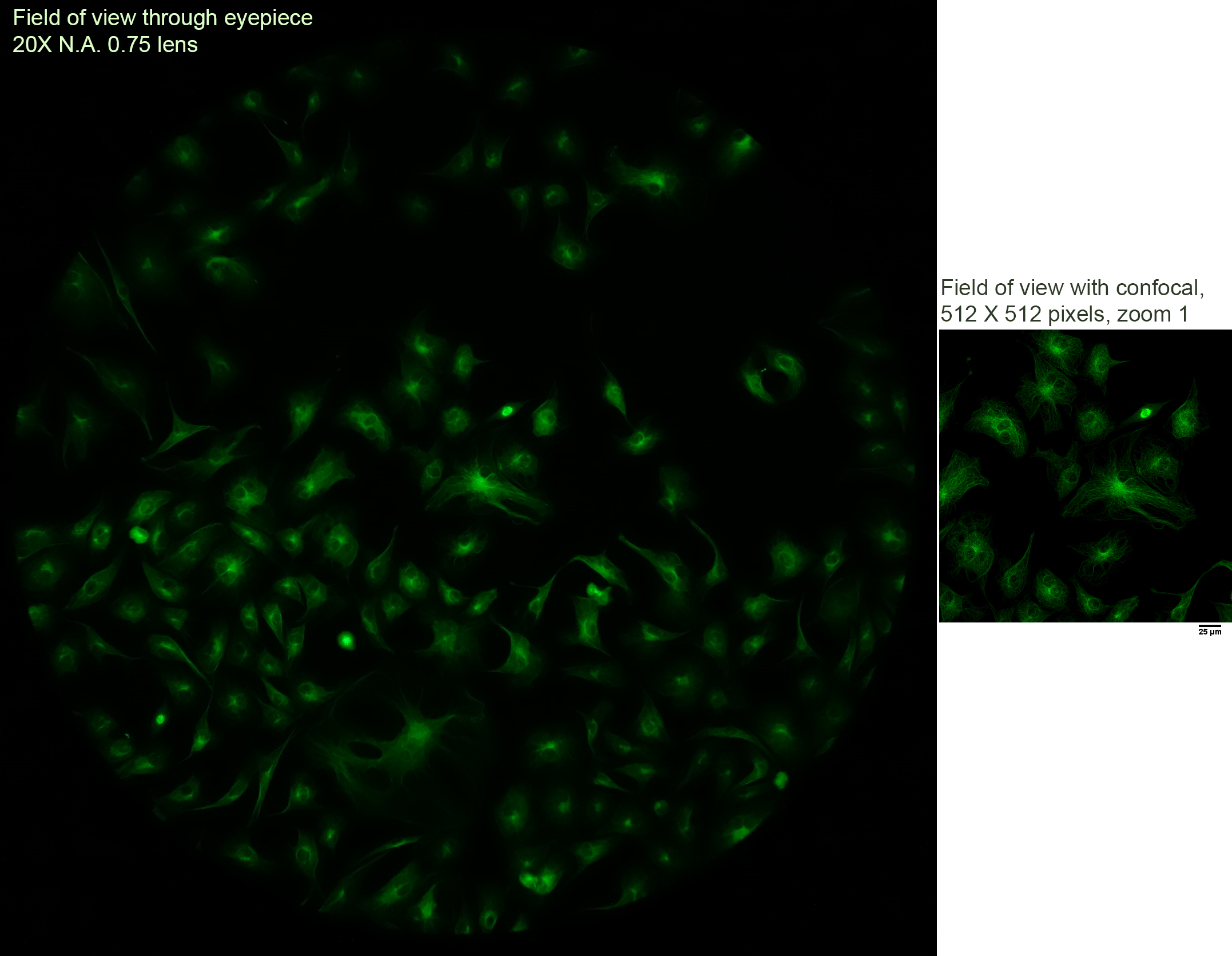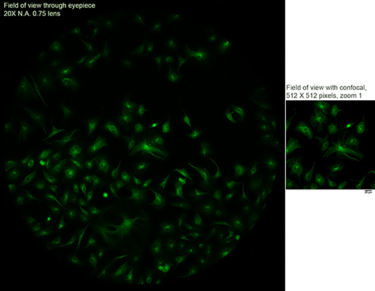 On the left is a snapshot of widefield fluorescence through the eyepiece. On the right is a confocal view at 512 X 512 pixels. (Full size images here.)