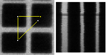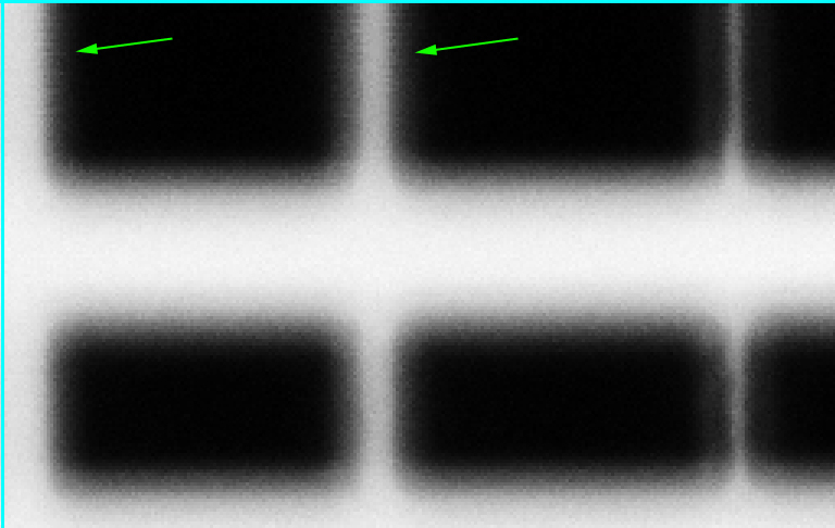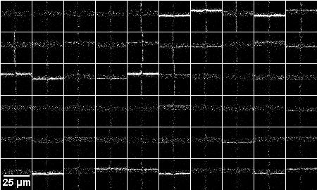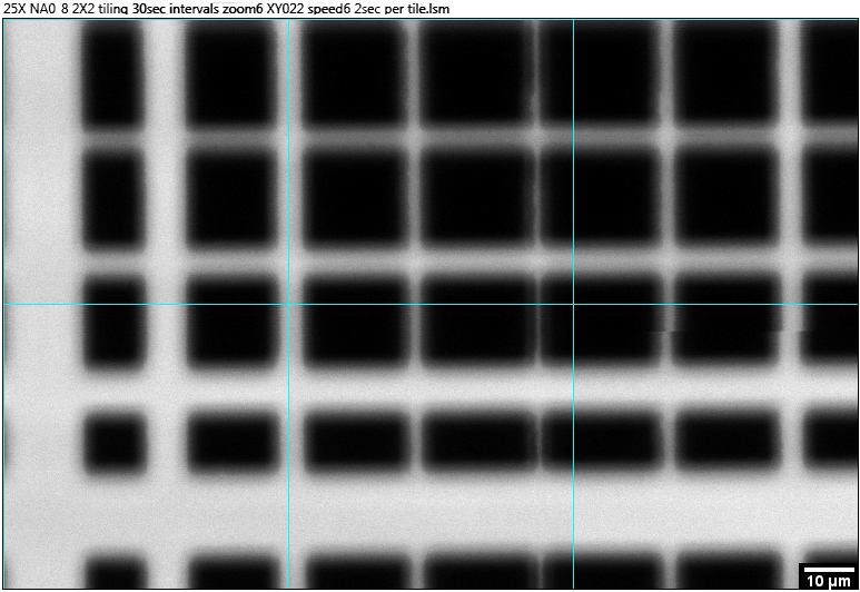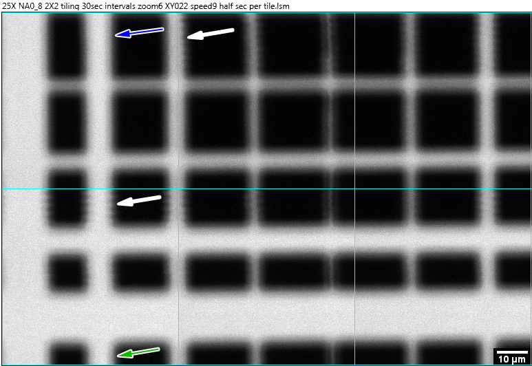 Cyan lines mark the edges of each 256 X 256 pixels tile collected. Each tile was scanned in 0.5 sec from top to bottom.