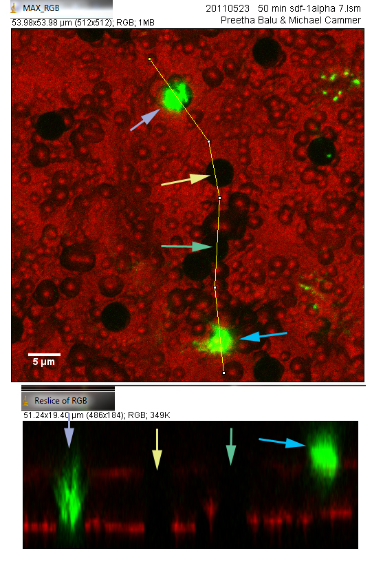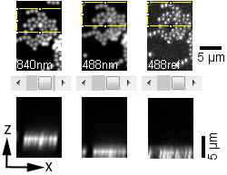 The images above (montage at the left) show single sections of a Z series taken at 1 um steps with the 40X water objective of green fluorescent beads glued to a MatTek dish and in water. These settings are the same as for the cells in the transwells. The top row is excitation of green fluorescent beads by 2-photon at 840 nm. The middle row is excitation of the beads by 1-photon 488 nm. The bottom row is reflection imaging at 488 nm. The montage at the right illustrates the shift by reslicing in the XZ axis.