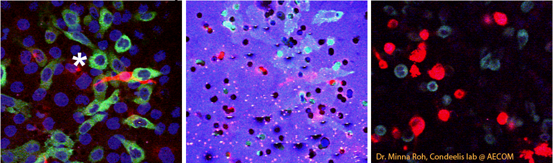 After discussion with Minna Roh in the Condeelis lab at AECOM, who sent impressive images, we decided to switch to multi-photon. We switched to a 40X water immersion objective. We had a problem imaging the filter, however. Whereas Roh showed that the filters she used emitted light across the visible spectrum when hit with the pulsed IR laser, we did not detect this in any channels available (420 to 760 nm detectors). Therefore, we decided to sequentially image fluorescence of cells by 2-photon and reflection by 488 nm.