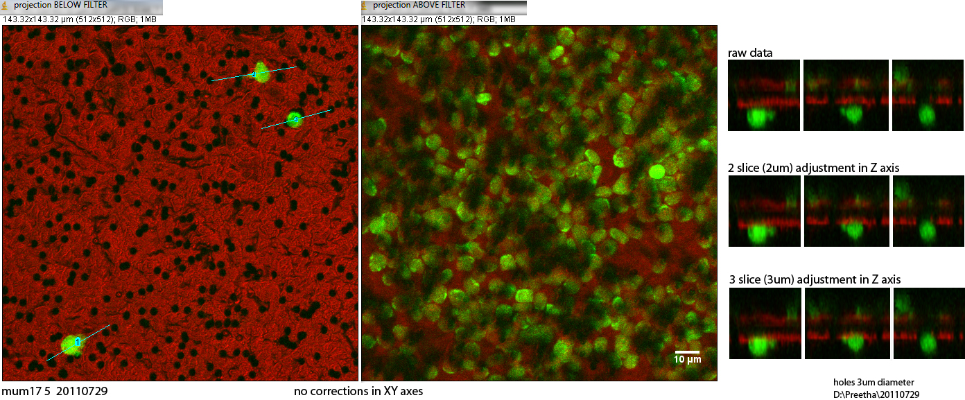Also, the light paths of the external and internal detectors are not in register in XY. Therefore, a simple XY translation needs to be applied to the images to accurately show the spatial relationship of the cells to the holes in the filter. These macros multiphoton_and_standard_confocal_registration_v100.txt are a quick, if not super user friendly way, to register all axes.