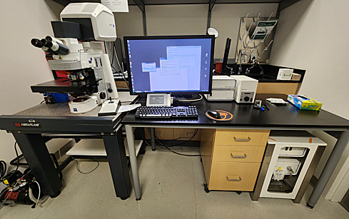 Upright microscope with 2 GaAsP detectors and motorized stage.