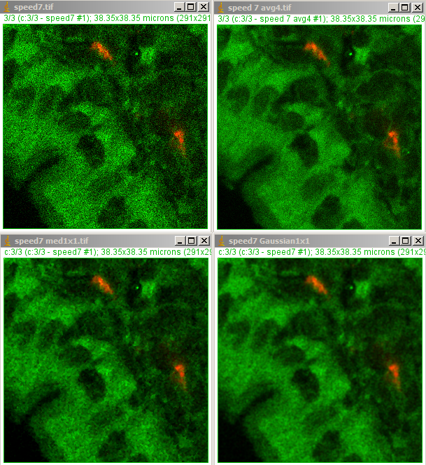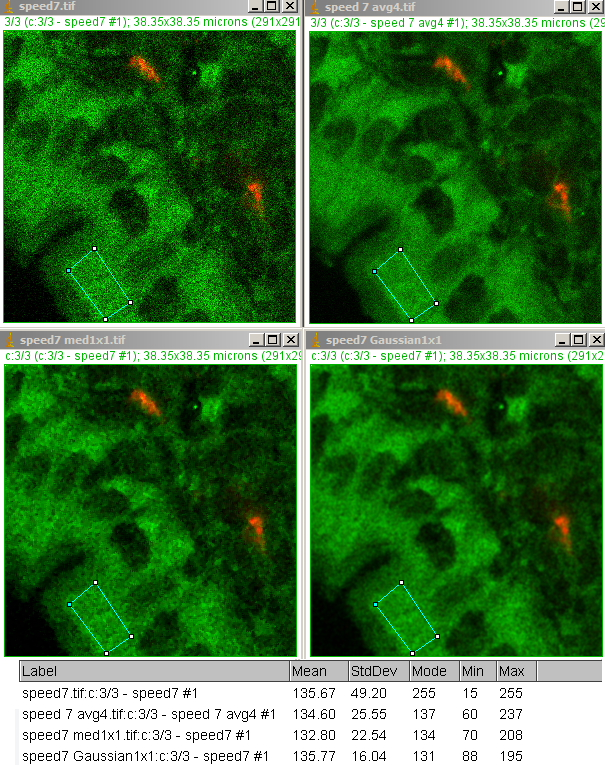 The green area measured is relatively uniform. If we had filtered on small few pixel objects (a.k.a. high frequency), the intensity values would have significantly changed, but for broader areas (low frequency), note that the intensity values don't change significantly (the biological conclusion wouldn't chenge). While the speed 7 average 4 image is the best, perhaps the unaveraged image is sufficient. Your call.