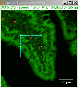 The original image was taken with 1 63X N.A. 1.4 lens at 1024 x 1024 pixels such that each pixel is 0.13 x 0.13 um. The image below is scaled to 25% and the cyan box represents the region that will be displayed at 1:1 pixels throughout the rest of the discussion of noise vs. speed and filtering. The images were saved as png instead of jpg to avoid spatial compression.