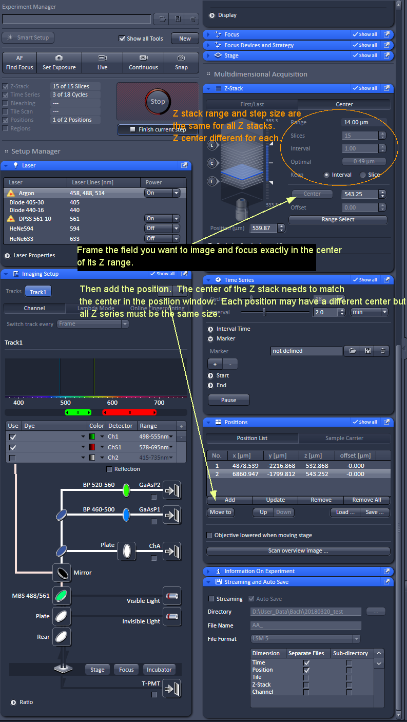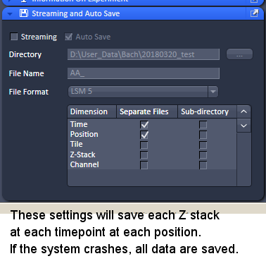 Zeiss recommends using Streaming. The example above uses Auto Save. We prefer the latter. The reason is that Streaming creates files that are reliant on the first saved file and difficult to use with ImageJ. Auto Save saves each file autonomously and is easy to use with ImageJ including during the experiment.
