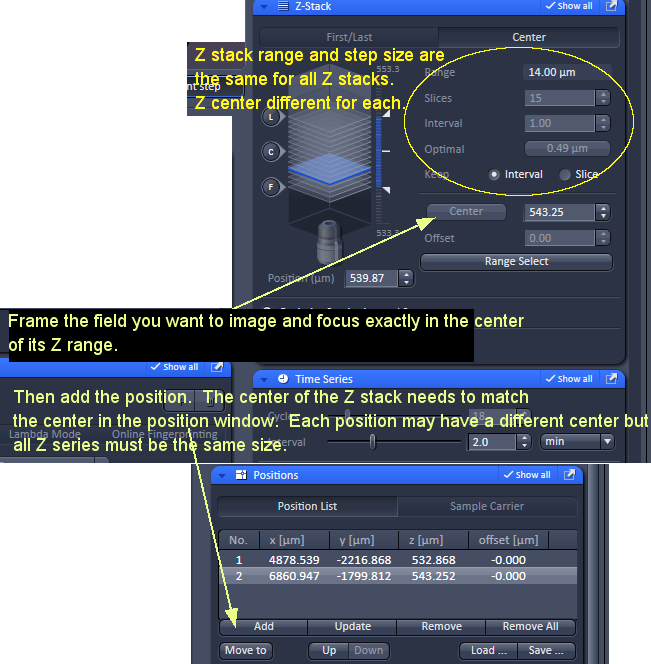 Z series with multiple positions only works with a center position set and all Z series must have the same number of slices, step size, etc.
