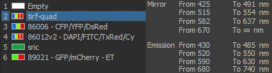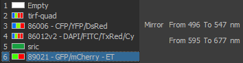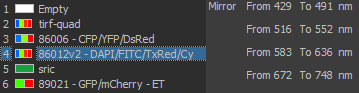 The settings above are for using TIRF to image blue, green, red, far-red, reflection, and brightfield. Note that in the far right column, which is called "Focus Offset", the 488 TIRF HSN setting has a little blue icon.