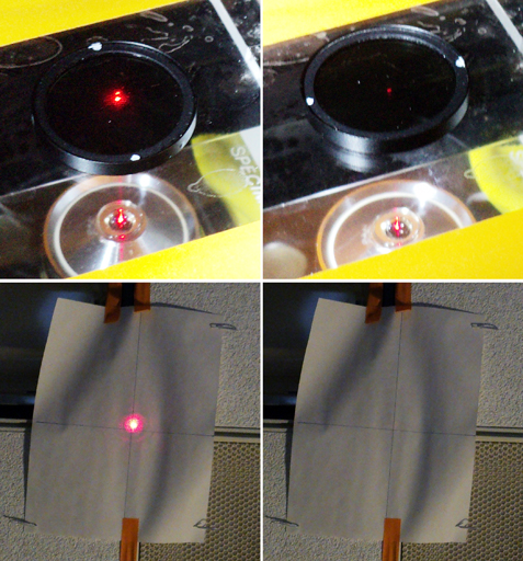 Right two panels show filter rotated 90 degrees and light blocked from projection on paper taped to ceiling.