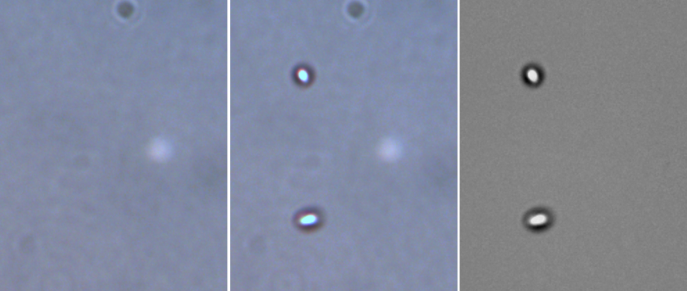 ![]() This microscope is dirty. The image at the left is a background image. The image in the center is the bacteria of interest. The image at the right is the final product. If you want to publish, take background images!! |