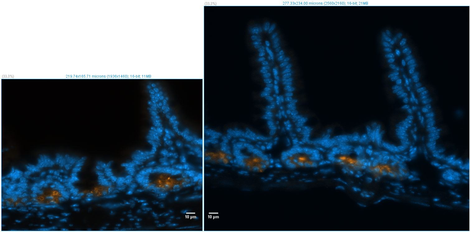The point of this web page is to show that the Zyla 5.5 sCMOS camera has a much larger field of view than the AxioCam (and other standard cooled CCD chips). Both images have the same resolution, but you can image a larger field with the Zyla 5.5.