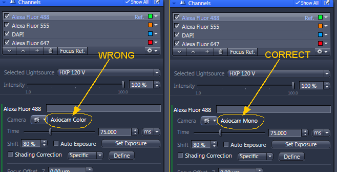 When you set up a new channel, you need to make sure you are using the correct camera and the correct microscope port.