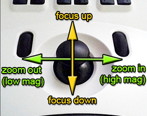 | This is how the Locate window should look. The yellow arrow points to a row of buttons that control the microscope. | If the buttons are missing, then you need to reassign them using the Configure... button. We are trying to figure out why the buttons sometimes disappear so that we may stop this from happening. |