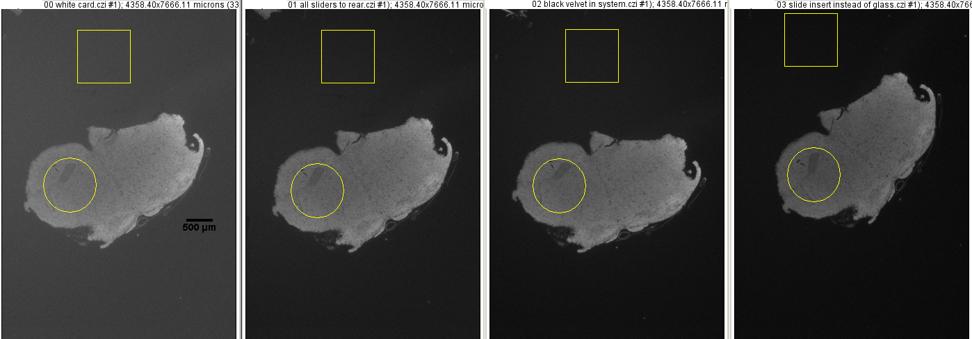 1. The image at the far left was taken with the white reflector for brightfield in place. Clearly, this elevates the background unacceptably.