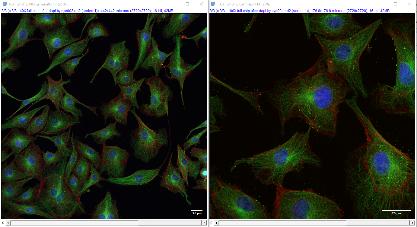 This means how large an image can you take. The largest image is 2720 X 2720 pixels. With the 40X lens, this covers 442 X 442 um. At 100X, the FOV is 177 X 177 um. Of course, you may choose a smaller FOV.