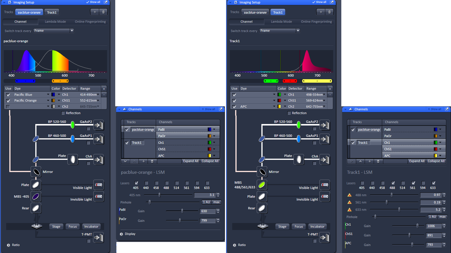 Here are tracks set up on the Zeiss 880 to effect this scheme. If the AF488 spills into the red channel or the red into the far-red, then the red channel (ex 561nm, em 569-624nm) could be put into an additional track.