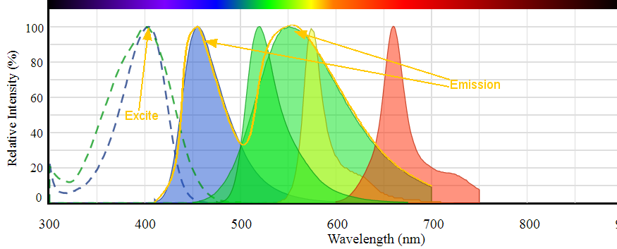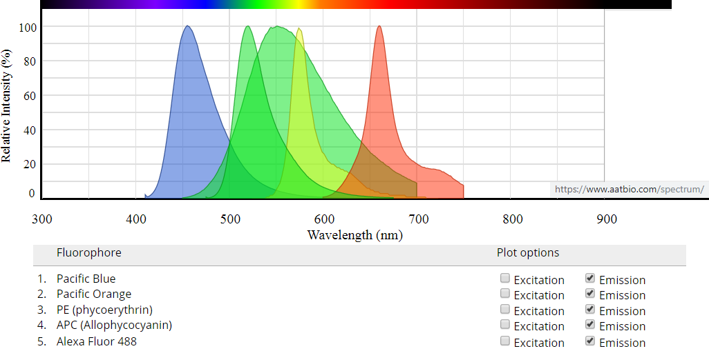 However, the middle one that overlaps broadly, which is Pacific Orange, is excited at 405 nm. Therefore, it may be imaged simultaneous with the blue probe and cleanly segregated from the other probes which are excited at 488, 561, and 633 nm. (And a far red probe excited at 405 nm could be added too for a sixth.)