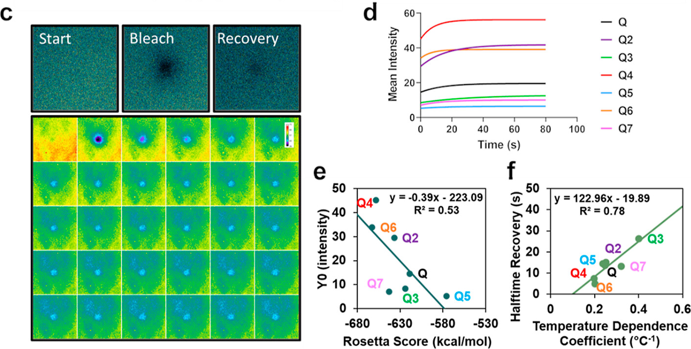 "(c) Representative FRAP imaging of the start (prebleach), bleach, and recovery (final postbleach) and corresponding montage showing the prebleach and the first 29 frames postbleach. (d) FRAP recovery curves were made by fitting to a one-phase association equation in Graphpad. (e) Linear correlation of Rosetta score to Y0 in one-phase association equation fit in Graphpad and (f) linear correlation of temperature dependence coefficient solved in respective phase diagrams to halftime recovery in one-phase association equation fit in Graphpad."