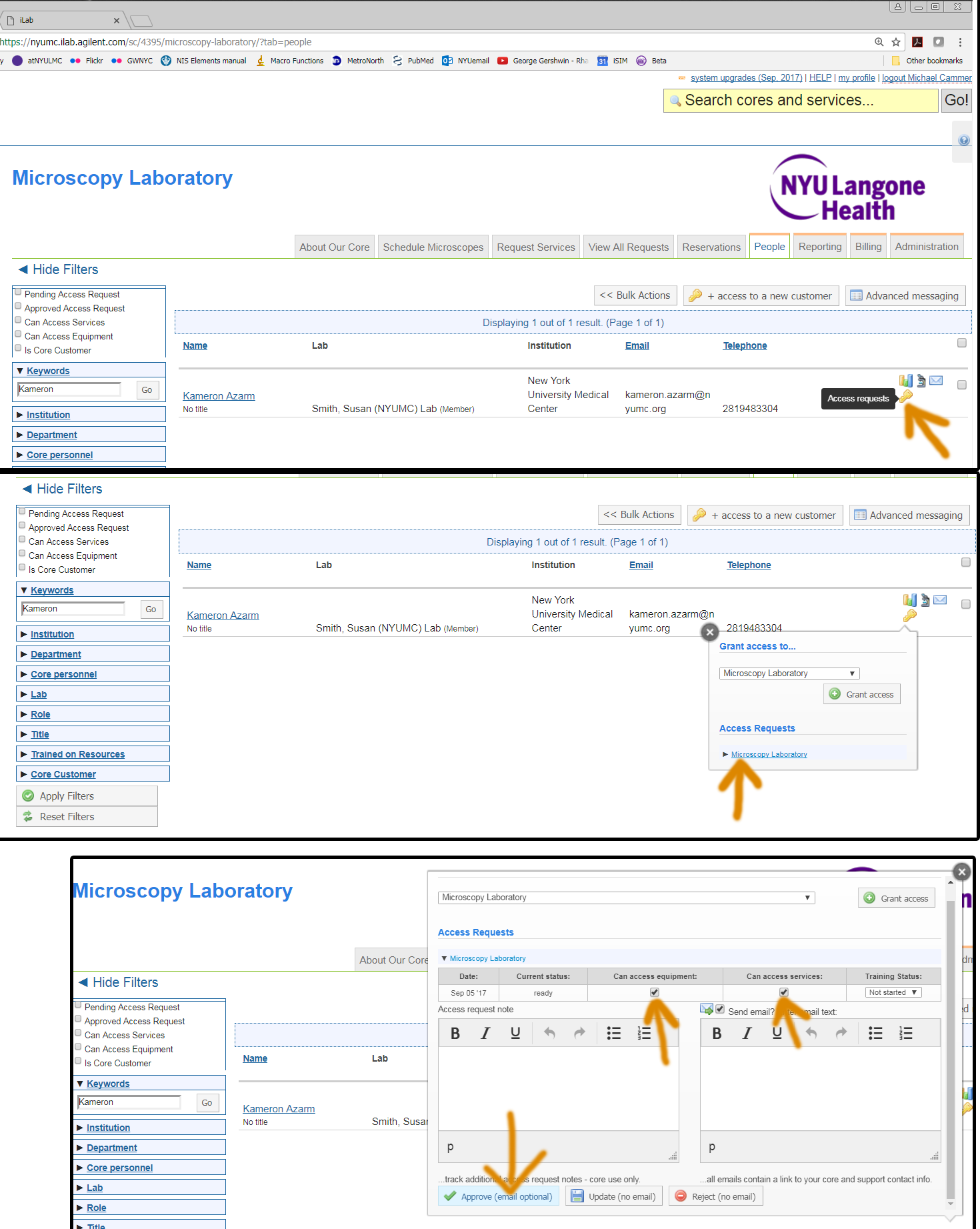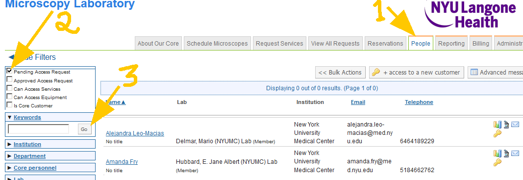 If they are not in the People list, this means that 1. they didn't specifically ask to join the Microscopy Lab from their iLab account (very common), 2.) they are already in our system (less common), or 3.) iLab isn't working right (hasn't happened yet in this situation, but don;t rule out the possibibility).