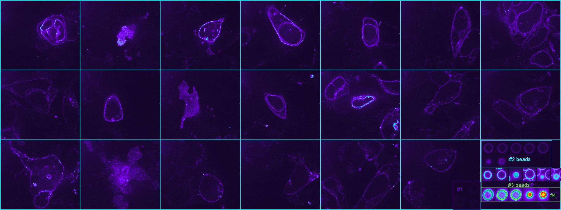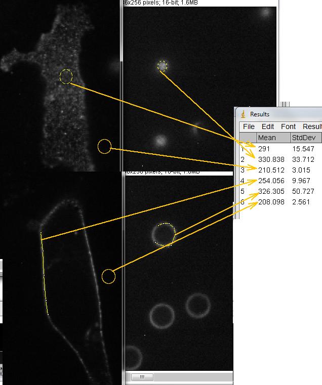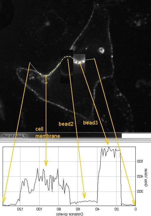 However, the fluorescent probes used on the beads were different than the GFP expressed in the cell membranes, so the two really could not be directly compared. But to follow the method below, you may pretend that the protein and fluorophore on the bead is the same as in the real live cells.