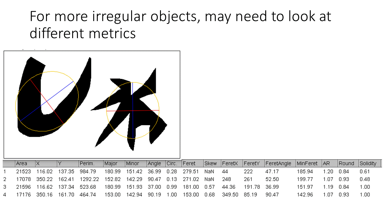 First, let's look at the metric of best fitting ellipse. A common shape descriptor is also the ratio of the major and minor angle.
