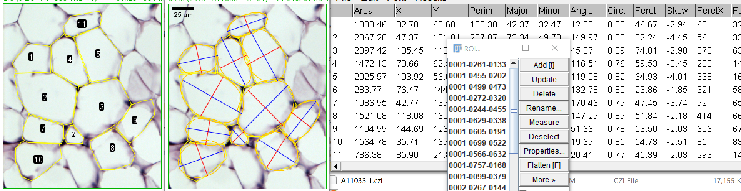 Left: hand tracings for fat cells. The ROI Manager (right inset) contains these ROIs.