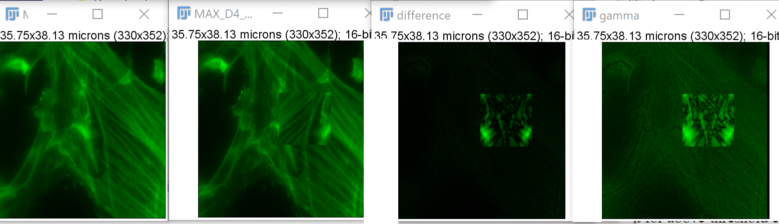 From left to right, the original images, difference of the two, and gamma 0.5 to show the low intensity values.