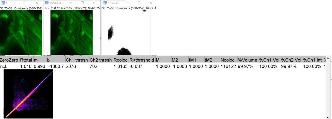 Warning! y-intercept far from zero - The ratio of the y-intercept of the auto threshold regression line to the mean value of Channel 2 is high. This means the y-intercept is far from zero, implying a significant positive or negative zero offset in the image data intensities. Maybe you should use a ROI. Maybe do a background subtraction in both channels. Make sure you didn't clip off the low intensities to zero. This might not affect Pearson's correlation values very much, but might harm other results.
