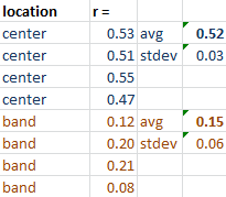The simulation could also be modified to change colocalization based on geometry. The simulation was designed to keep the spots in a circle to have a modicum of resemblance to a cell stuck to a coverslip. Putting an if statement in to look at the random part of the amplitude is a simple way to make the center of the cell and band around the outside have different colocalization coefficients. is < 0.5, make the chances of colocalization some percentage greater with an additional random() call and < or > 0 to 1.