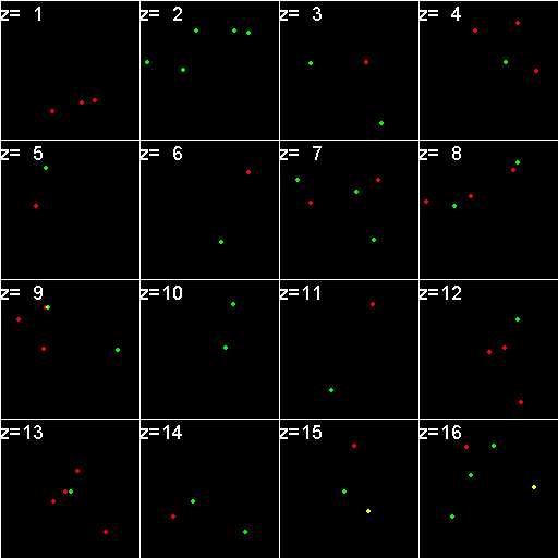 When analyzed in their original spatial locations within a volume sampled by thin slices, most of the objects are shown to not colocalize. Only in z = 9, 15, 16 is there any colocalization and only in z = 15, 16 is the colocalization the same spots. (Simulation made with CZ_simulation_v100.txt)