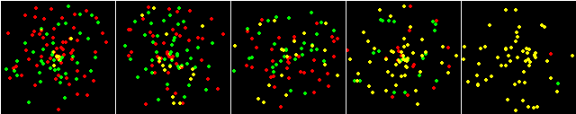 The simulation above is 900 spots of each red and green distributed over 16 cells where the spots remain mostly discrete.