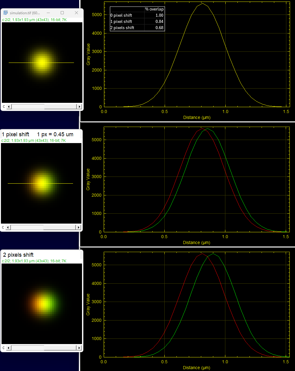 In this example, for a group of fluorescent molecules smaller than the resolution of the microscope, only the top image is colocalized. The other two examples show the discrete aggregation of molecules in each channel abutting or near each other.