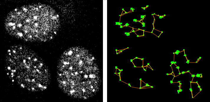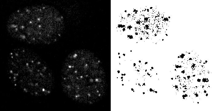 A tangent: clustering. The following image has the problem of only being from a single optical section of a 3D cell nucleus, but this analysis or segmenting could be extended to 3D. For a description of what this represents, please see clustering webpage and the measurements here were generated with this macro.