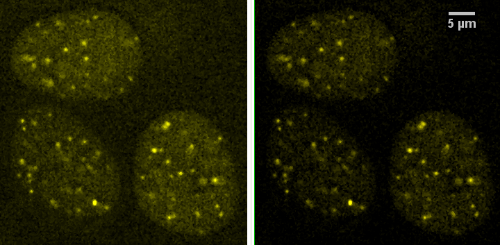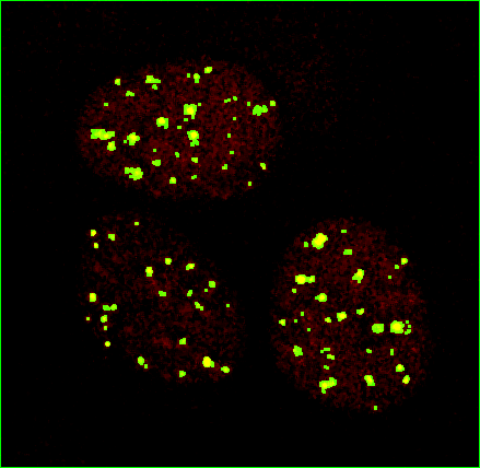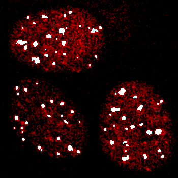 Purpose of this webpage is to investigate the numbers we get with different measurements of colocalization, such as Pearson's correlation, simply how much overlap particles have, or other methods, of 2D images. For instance, is a spatial relationship of puncta really strong evidence of interactivity? A large part of this depends on the biological system. Vesicles or lysosomes may contain molecules that are there with the only relevance being that they are being degraded. Or maybe the molecules really have a functional interaction, even if by intermediaries. Or maybe they don't have direct interactions but are within the resolution of the system. And within the noise of the imaging system. Unless explicitly stated otherwise, the puncta below really are or are simulated to represent clusters of many molecules. Think of the resolution of the system as each voxel being 0.13 X 0.13 X 0.5 um and one optical section through a 3D volume. A specific protein in cell nucleii was imaged.