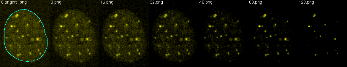 The get the below results for r =, the images were converted to 8 bits and thresholded (a constant subtracted) at increasing values to reduce background and priviledge bright structures. All three cells were measured independently and results averaged. Pictured here are the example thresholds for one of the cells and how it was segmented for the measurements.
