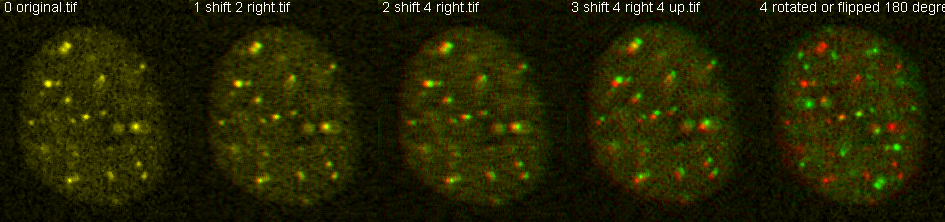 What is r=? What happens when shifted? Used macros at http://microscopynotes.com/imagej/colocalizationspotssimulation/index.html and Pearson's through time webpage repackaged as colocalization_and_labelling_macros_used.txt.