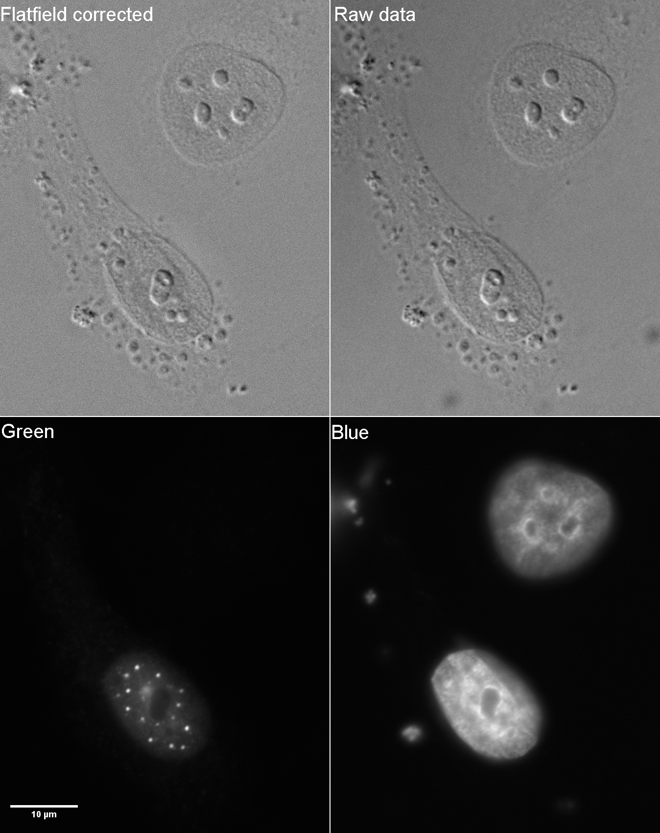 Flatfield correction is also is useful for correcting uneven illumination or out of focus imperfections (e.g. dust) in the optics.