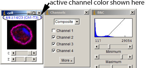 The displayed channels (and colors and contrast ranges) may be programmed in a macro so that they do not have to be manually set for each image that is opened.