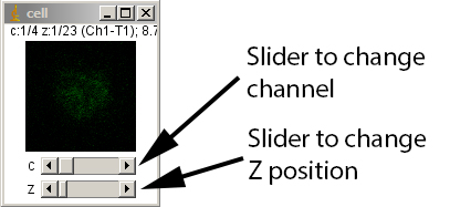The active channel may be changed by moving the "C" slider and the color of the active channel is displayed as the text color at the top of the image.