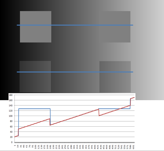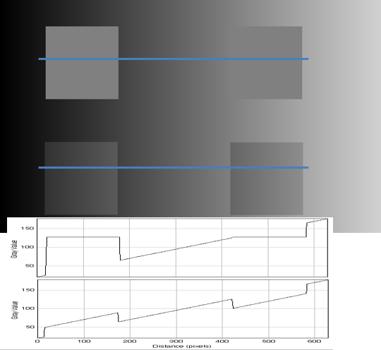 The top two squares are uniform; all pixels are the same value. The bottom two squares have a horizontal gradient; the pixels change from left to right. But the average value of the pixels in the bottom right square is the same as the pixel value of the top two squares.