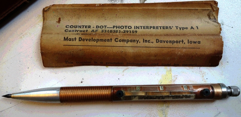 Use the knob at the top to set the counter to zero. Then click, press down, on each feature in a photo. Counter incremented with each push. You'd know it was counted and don't count again because a hole would be punched in it. Good idea to do this on a wood board or layers of shirt cardboard. "Shirt cardboard"? Shirts from the cleaners would be folded around a piece of cardboard. My how times change!