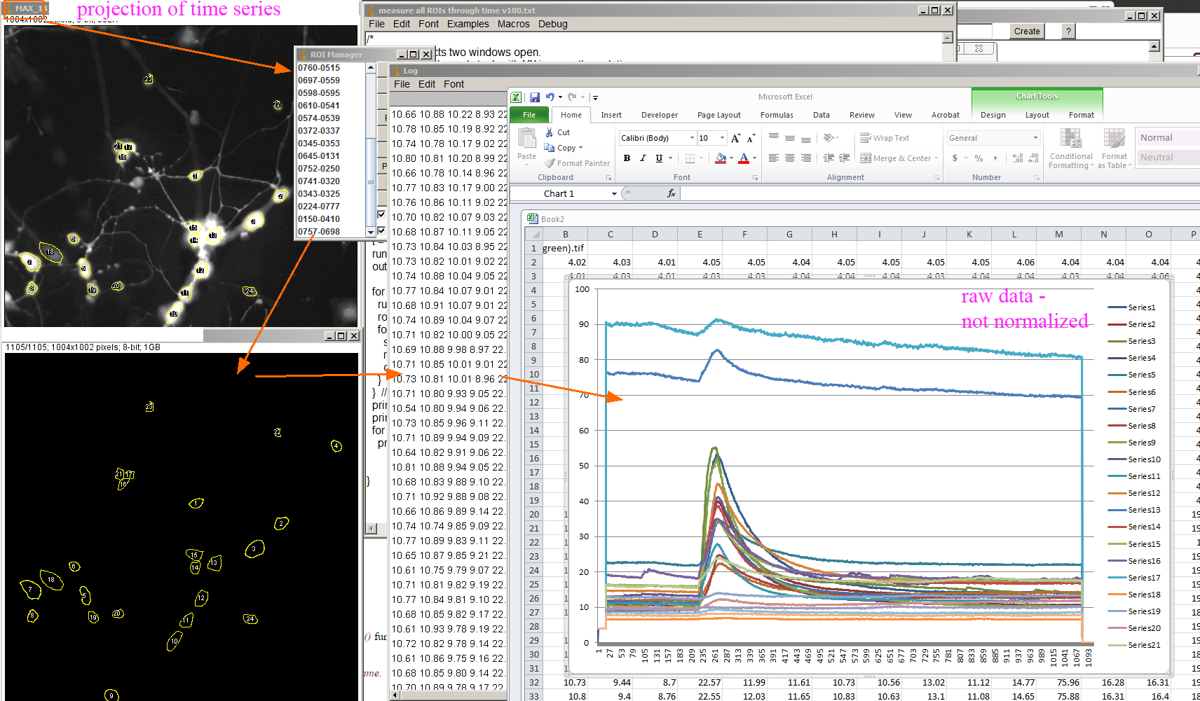 Then using threshold and magic wand tool to add cells that are not touching and manually tracing to add cells that are touching.Output is columns of tab delimitted numbers that may be saved as text file or copy and pasted into favorite spreadsheet program.