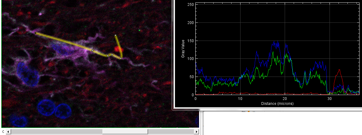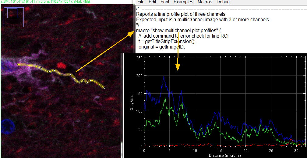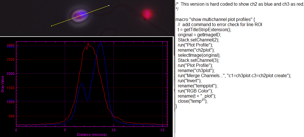 | In 2024 these macros were replaced with "Multichannel plot profile" in MC_macros.ijm which also produce a table with the intensity values of each channel. They may also be used with a macro which regularizes the length of the plot centered on a feature of interest. |