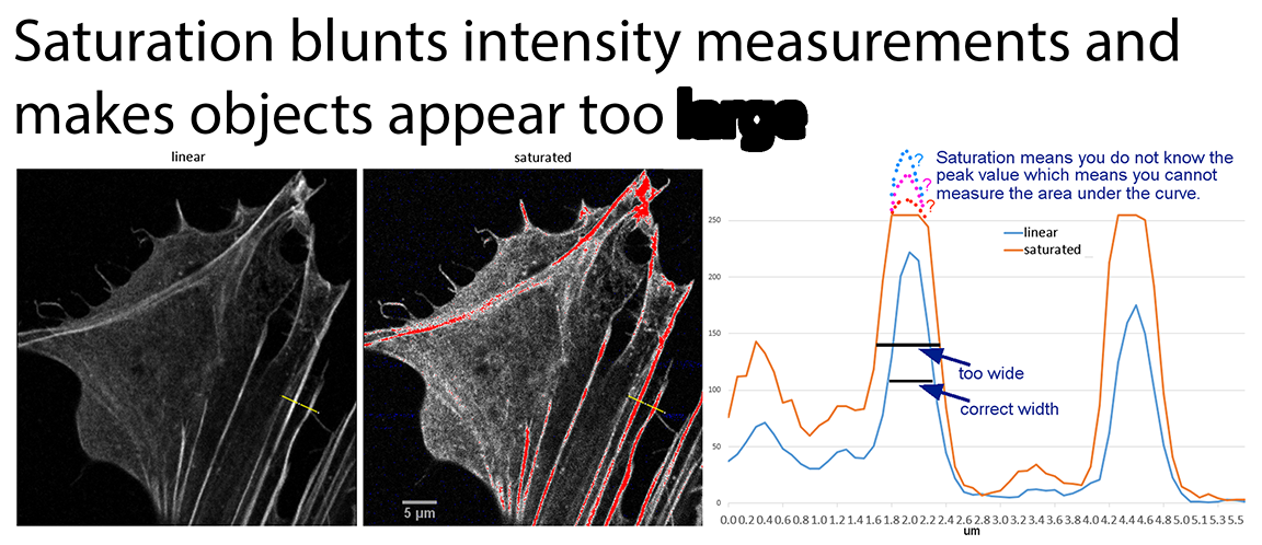 A common reason people saturate their images is to see very weak signal next to bright signal. The correct thing to do is use more than 8 bits for a wide dynamic range, collect low noise images, and use gamma, sqrt, log scale, or local contrast enhancement to show the images and explain this in the text. But keep the raw data for intensity measurements that reflect the actual numbers of molecules in different locations.
