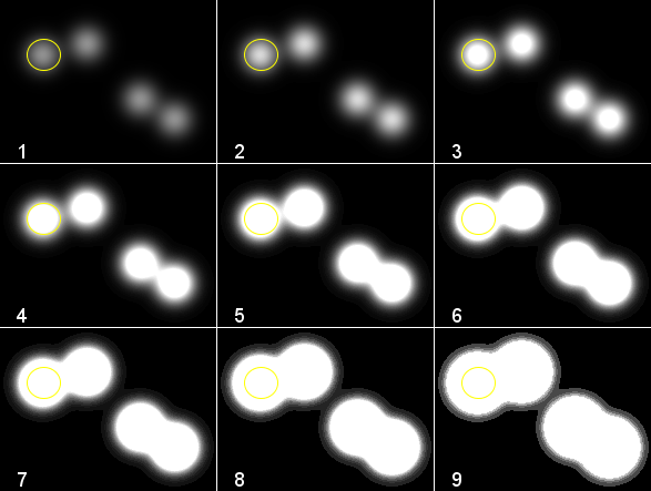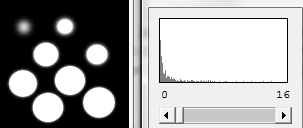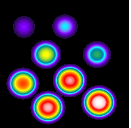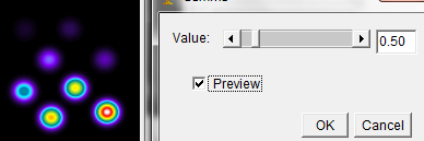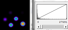 The following image has 8 spots. The dimmest spot has a max intensity approx 14 and the brightest one 29600. These extremes cannot be displayed on a linear scale. With a linear range to see the brightest spot without saturating, where are the least intense spots?