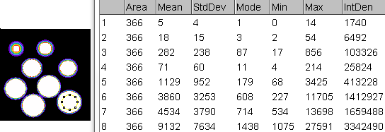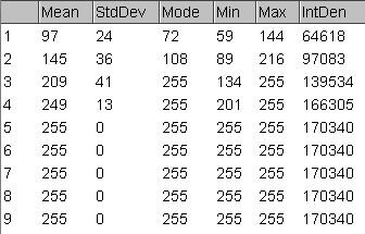 Regardless how you scale the images to show the features, the raw data measurements are the same. The yellow circle was centered over each spot and the numbers recorded.