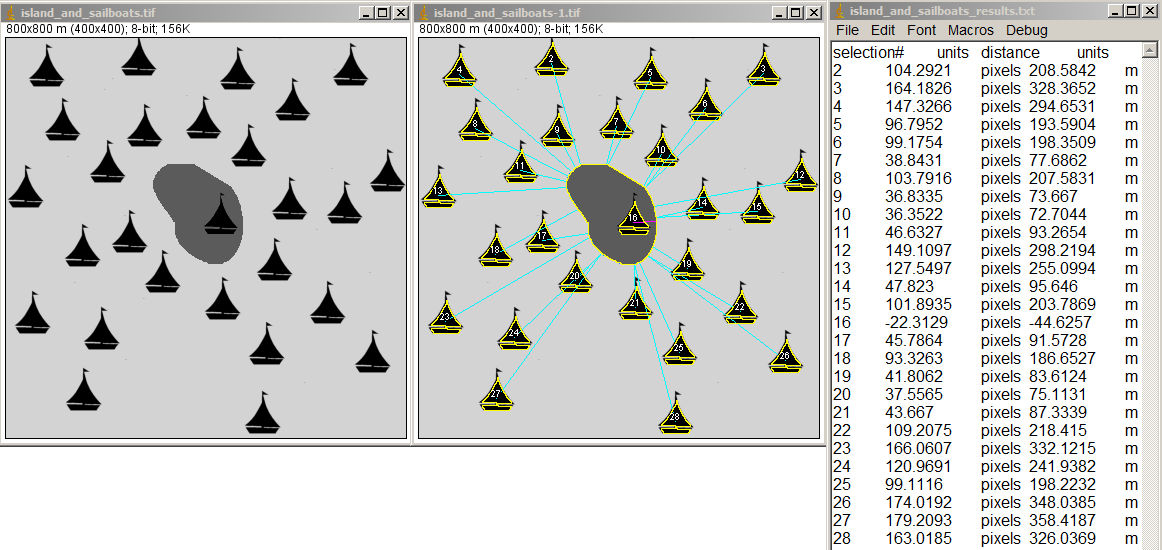 To create the example above, the original image calibrated in meters had the regions of interest marked and the macros applied to get results. Note the the boat on the island (#16), which was washed up and beached in Superstorm Sandy, has a negative distance from the perimeter of the island.