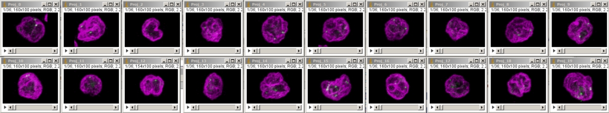 To export each cell as its own individual Z series, run "clip all ROIs in Roi Manager each as a stack [F4]" in crop_and_montage_stacks_v100.txt (written circa 2011, perhaps needs rewriting) or to make a 3D rotation of each cell as pictured below, run "pull all Z series from two windows, merge, and 3D" in quick_3D_macro_v100.txt with the appropriate window names inserted into the macro.