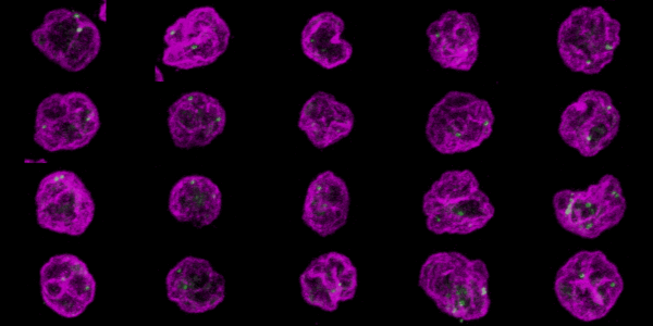 The nucleus was labeled by immunofluorescence for Lamin A shown here in magenta. The FISH probes are shown here in green. Imaging with a 63X NA 1.4 planapochromat lens with a Zeiss LSM 710 laser scanning confocal.
