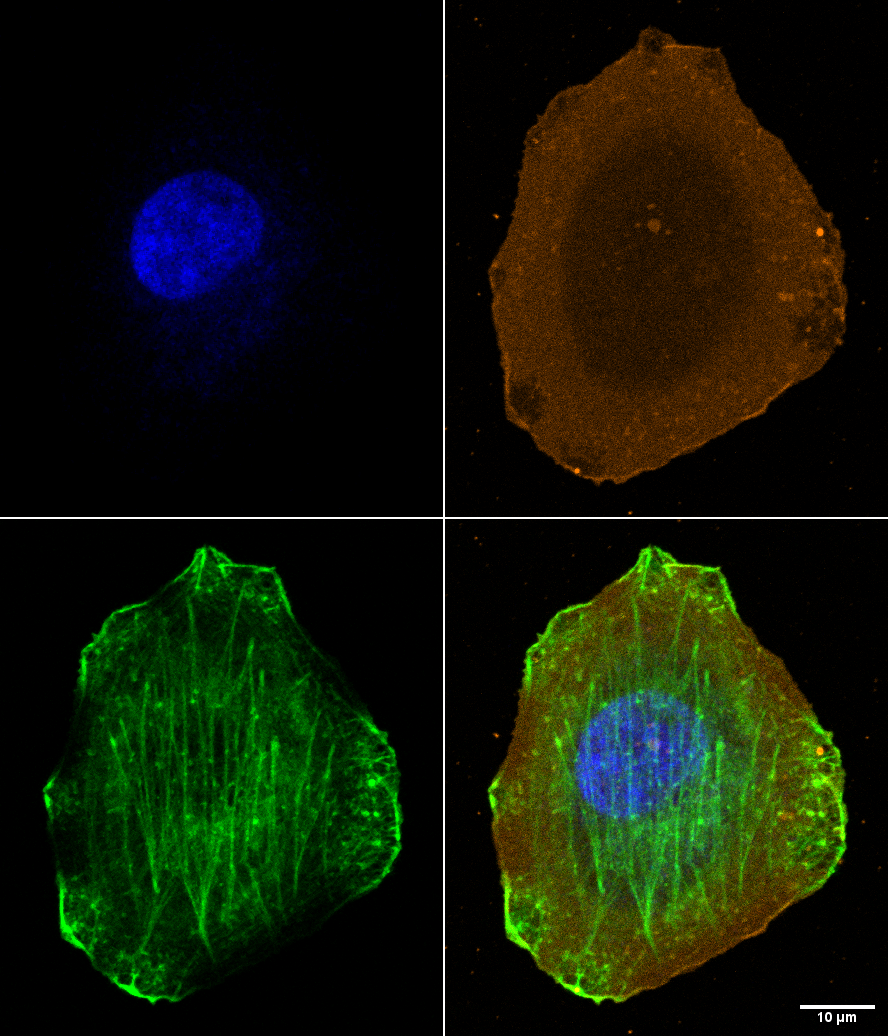 The image below shows a mammalian vero cell in culture on a #1.5 coverslip that was bathed in a red dye (attached to a lectin maybe?) that bound to proteins exposed onthe outside of the cell membrane and then was fixed with fresh 2% PFA. While imaging the red probe (orange), DNA labeled with dapi (blue), and transmitted light (gray) we decided to try adding Alexa 488 phalloidin to light up the f-actin (2 ul into 1 ml). The green image shows that a lot of the actin gets labeled, but there are unlabeled patches. Also, the brightest regions at the periphery appear to correspond to unlabled patches in the orange or, more likely than unlabeled, are regions where the membrane was damaged thus allowing entry of the AF488-phalloidin.