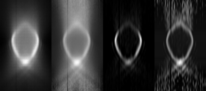 From left to right, widefield XZ sections with raw data and with contrast adjusted per XY slice before XZ section and at right confocal versions.